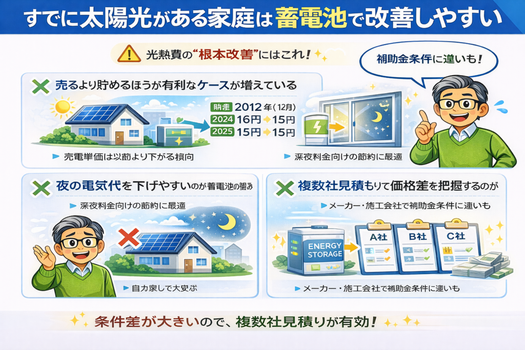 すでに太陽光があるなら、蓄電池はかなり相性を見やすい選択肢です。