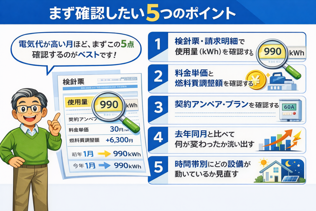 なので最初は、**料金そのものよりも使用量(kWh)**と前年同月の差を見るのが正解です。