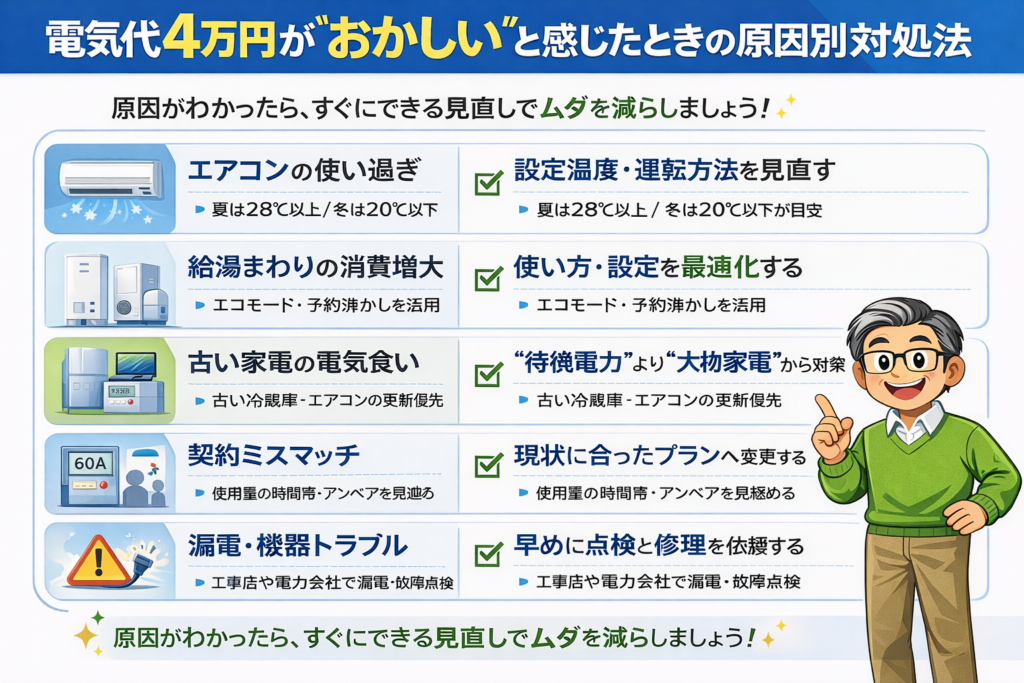よくあるのが、「とりあえずLEDにした」「待機電力を切った」では、思ったほど下がらないケースです。もちろん無駄ではありませんが、**4万円クラスの請求を動かすのは“大物家電”や“熱をつくる設備”**です。