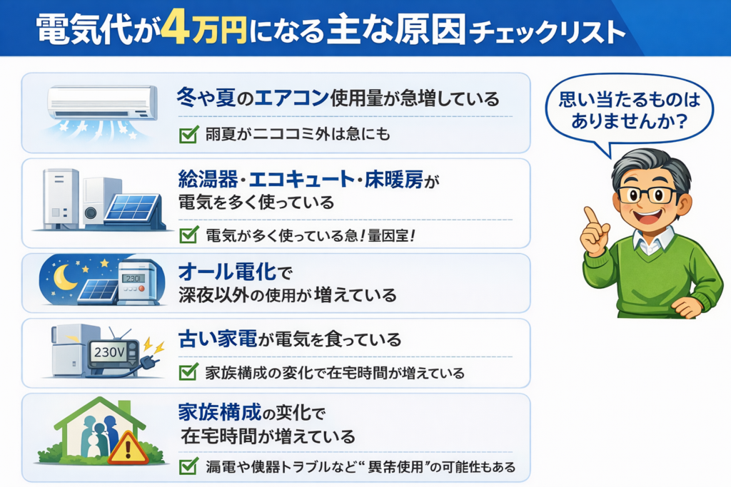 電気代が高いと、つい「家族が使いすぎているのかも」と考えがちです。ですが実際は、犯人がひとつとは限りません。大きく使う設備がいくつか重なることで、一気に4万円台へ乗ってしまうことが多いんです。