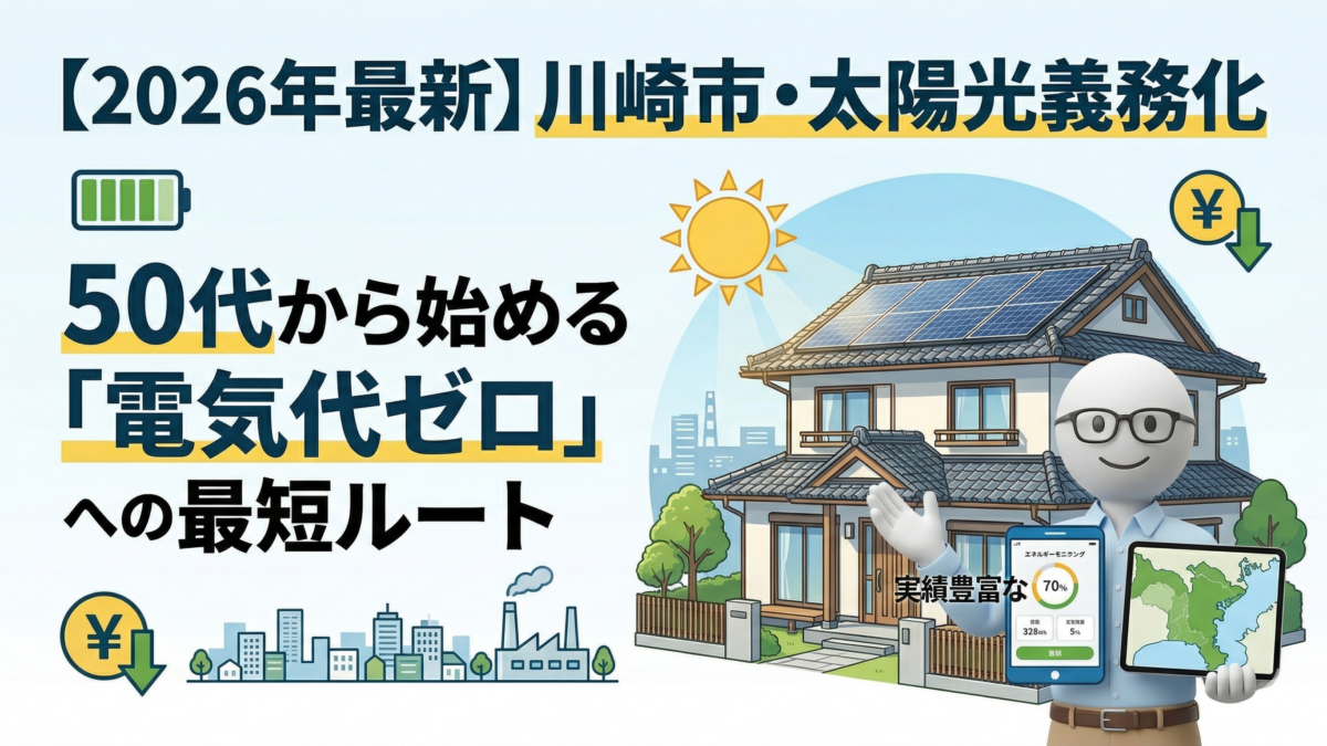 川崎の皆さん、お待たせしました。義務化のニュースで『損をしたくない』と焦っていませんか?元エンジニアの私から言わせれば、これは『人生の固定費』を削り、身軽に終活へ向かう絶好のチャンス。2026年最新の補助金を使って、賢く『電気代ゼロ』の家を整えましょう!