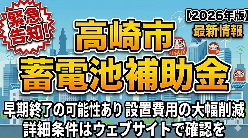 結論:2026年4月時点で高崎市単独の蓄電池補助金はなし。利用できるのは「群馬県(最大約30〜50万円)」または「国(最大60万円)」で、いずれも契約・工事前の申請が必須。