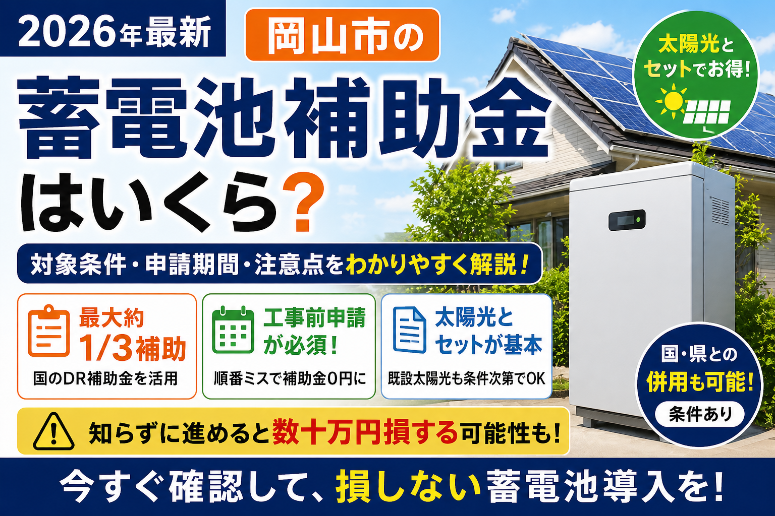 岡山市で蓄電池補助を狙うなら、太陽光とセット設計+工事前申請が必須。単体導入は不利で、申請タイミングを外すと補助金は一切出ない。