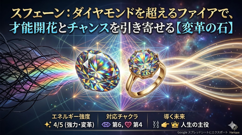 スフェーンは、ダイヤモンドをも凌ぐと言われる「ファイア(虹色の輝き)」を放つ石です。この多色性の光は、あなたの内側に眠っている多面的な才能の象徴です。