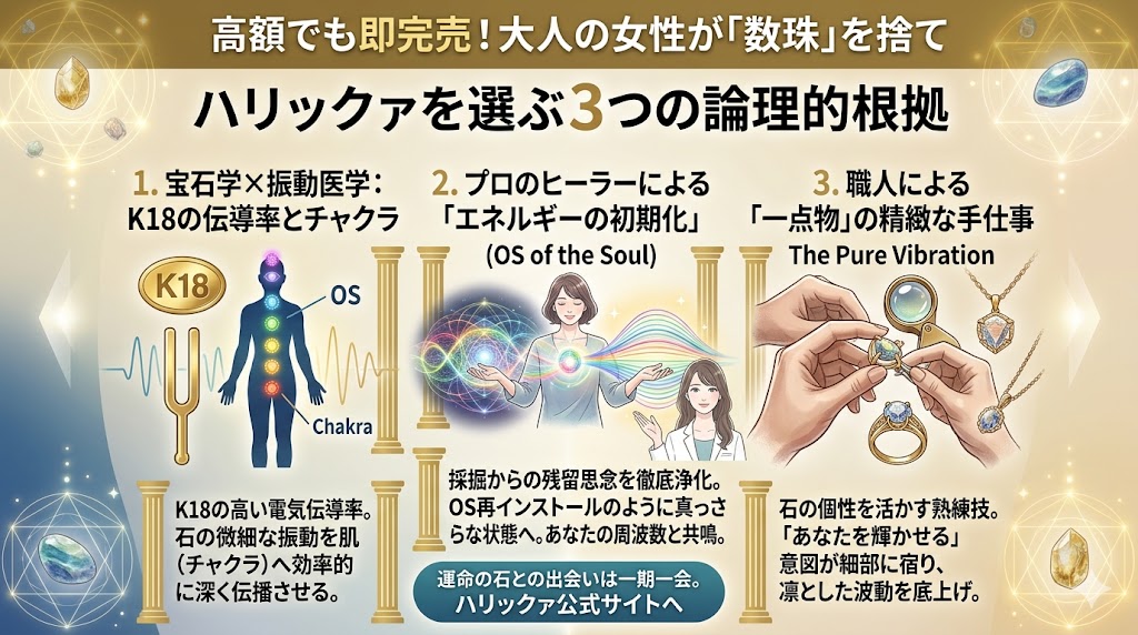 ハリックァの口コミを見て、迷っていらっしゃるのね。分かります。安くない買い物ですもの、絶対に失敗したくないですよね。でも、宝石選びは単なる『買い物』ではなく、乱れた波動を調律する『自分への投資』。岡山で未病カウンセラーとして多くの波動を整えてきた私が、なぜハリックァがこれほどまでに選ばれるのか、その真実を科学的な視点と愛をもって解き明かしますね。