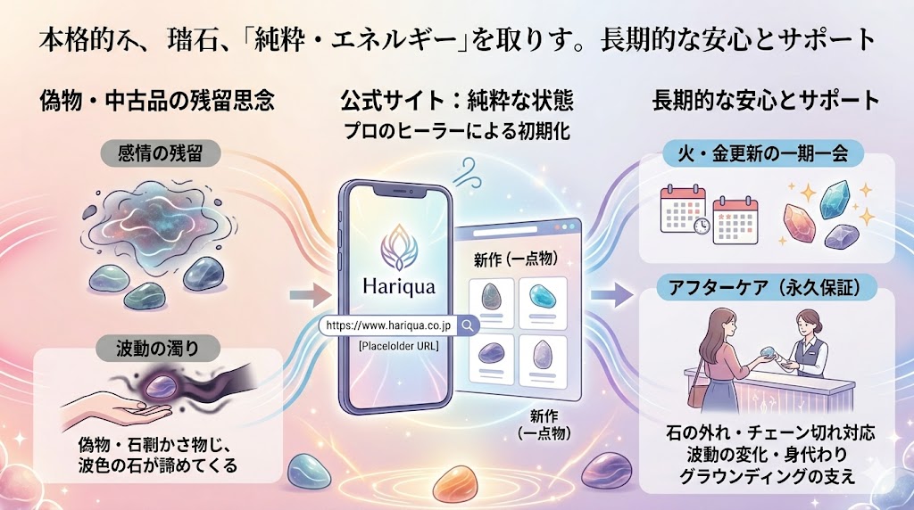 また、ハリックァには「永久保証」があります。石が外れたり、チェーンが切れたりすることは、波動の大きな変化や「身代わり」として起こることもあります。そんな時、実店舗や郵送で丁寧にケアしてもらえる安心感は、あなたのグラウンディング(地に足をつける力)を生涯にわたって支えてくれるでしょう。