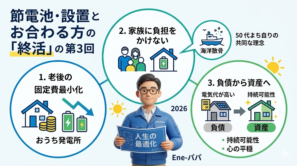 終活の第一歩は、身の回りの整理(断捨離)だけではありません。「将来の支出を予測可能にすること」こそが肝心です。 現役時代のように安定した給与所得がなくなった後、最も怖いのは「インフレによる生活費の増大」です。今、補助金があるうちに蓄電池を導入し、電気の自給率を上げておくことは、老後の自分に対する「仕送り」を作ることと同じです。家のエネルギーシステムを完結させておくことで、年金生活に入ったあとの不安を一つ消し去ることができるのです。