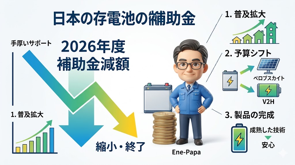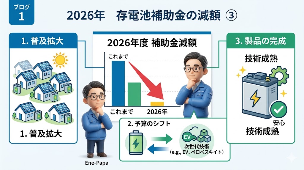こんにちは、エネパパです。2026年、蓄電池の補助金が減額…というニュースに驚かれた方も多いはず。でも元エンジニアの私から見れば、これは『今が人生の整え時』という合図。家計の守りを固め、老後の安心を最大化する戦略を、世田谷の自宅から論理的にお伝えしますね!